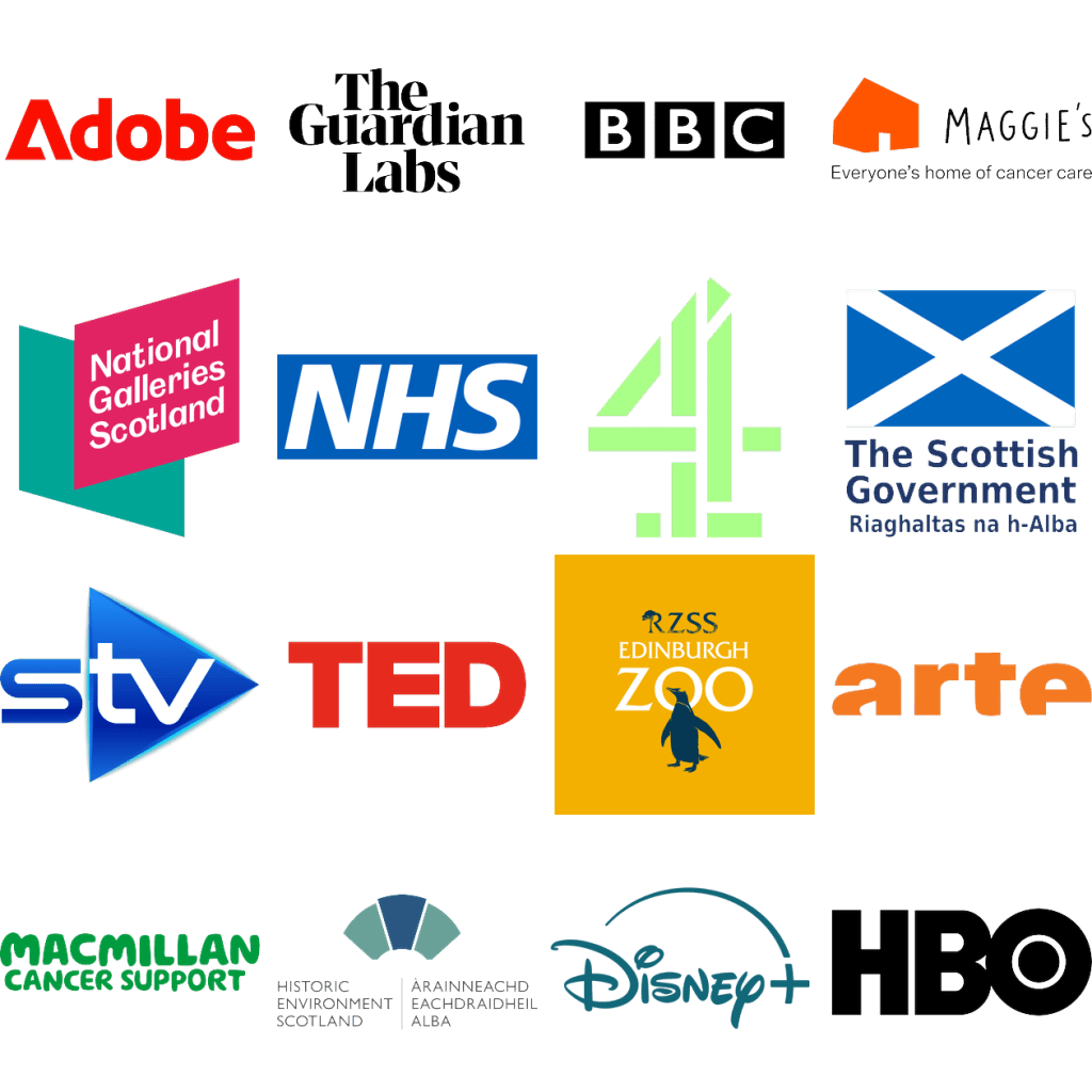 With 15+ years of experience, I’ve worked with broadcasters, charities, production companies, agencies, and global brands, including BBC, Channel 4, STV, HBO, Disney+, ARTE, Adobe, TED, Guardian Labs, Maggie’s, Macmillan Cancer Care and many others… (see below)